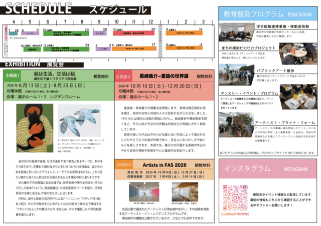 Fujisawa City Art Space (FAS) was established in 2015, as the base of creating and promoting the art culture of the city. It has a working studio space, and organize exhibitions that support emerging artists in their art production and promote their artworks. It also runs various workshops and ‘Artists in FAS’ residency program which calls out for proposals and holds the exhibition of the participants achievements.