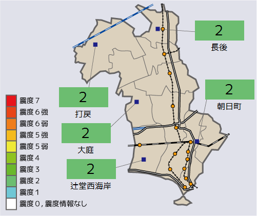 | 長後 | :震度2 |