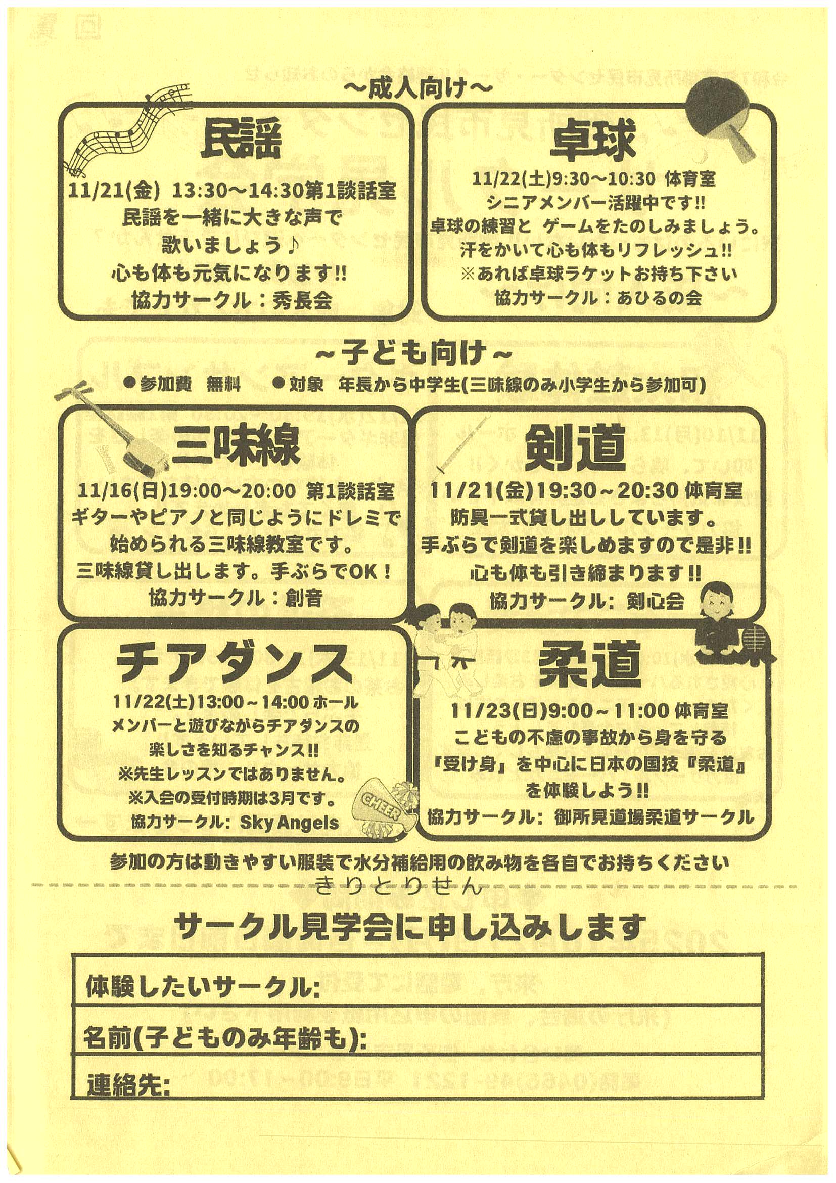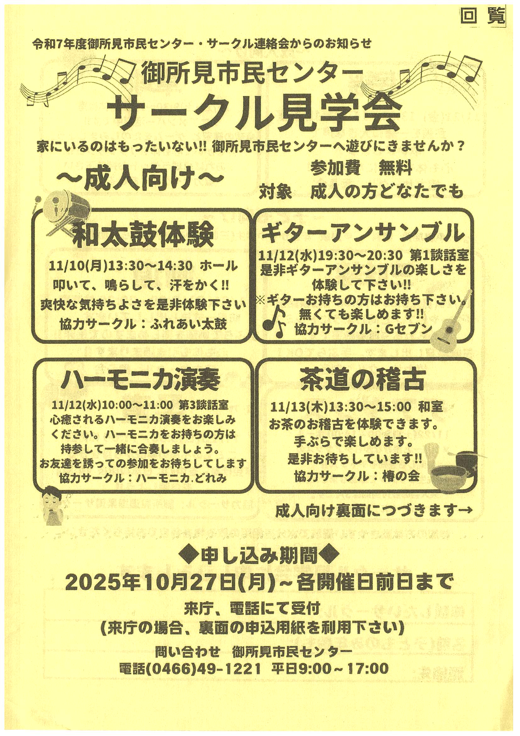 - 御所見市民センターサークル見学会【申込期間:10月27日(月曜日)~】