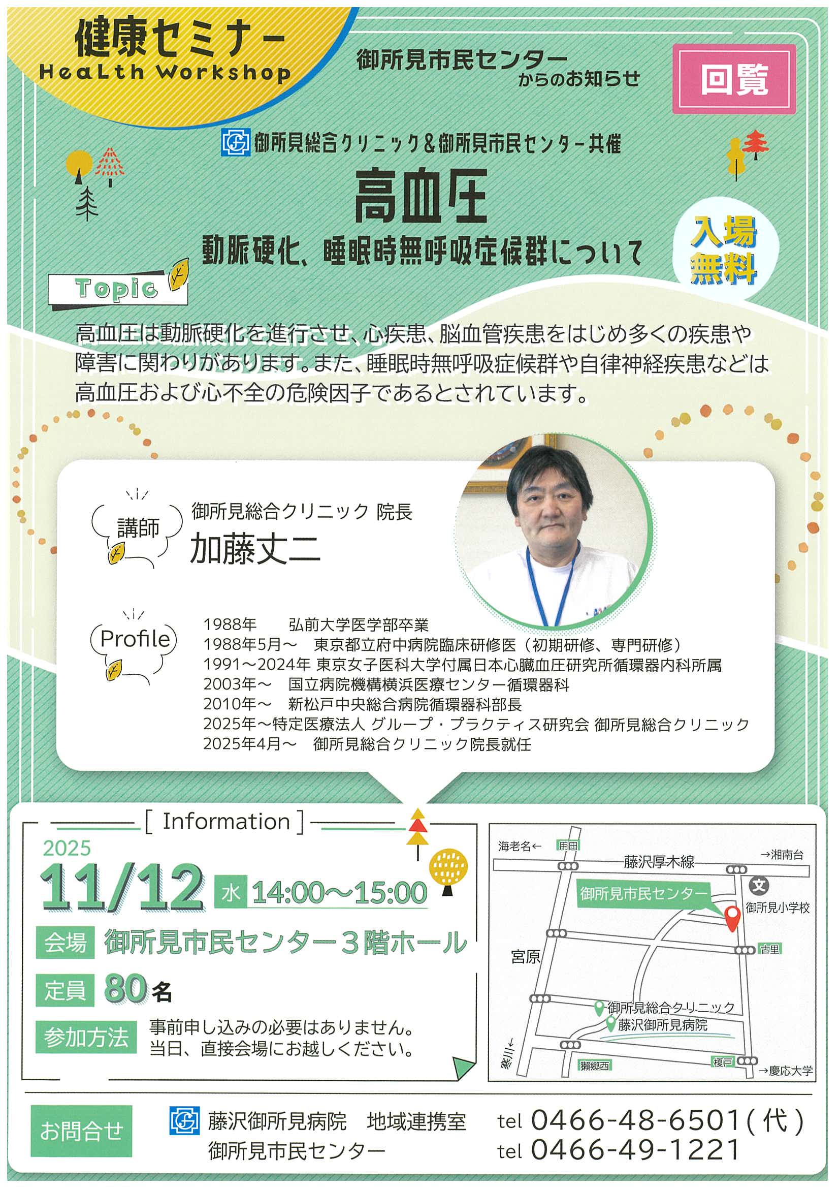 - 健康セミナー「高血圧、動脈硬化、睡眠時無呼吸症候群について」(JPG:395KB)【11月12日(水曜日)開催】