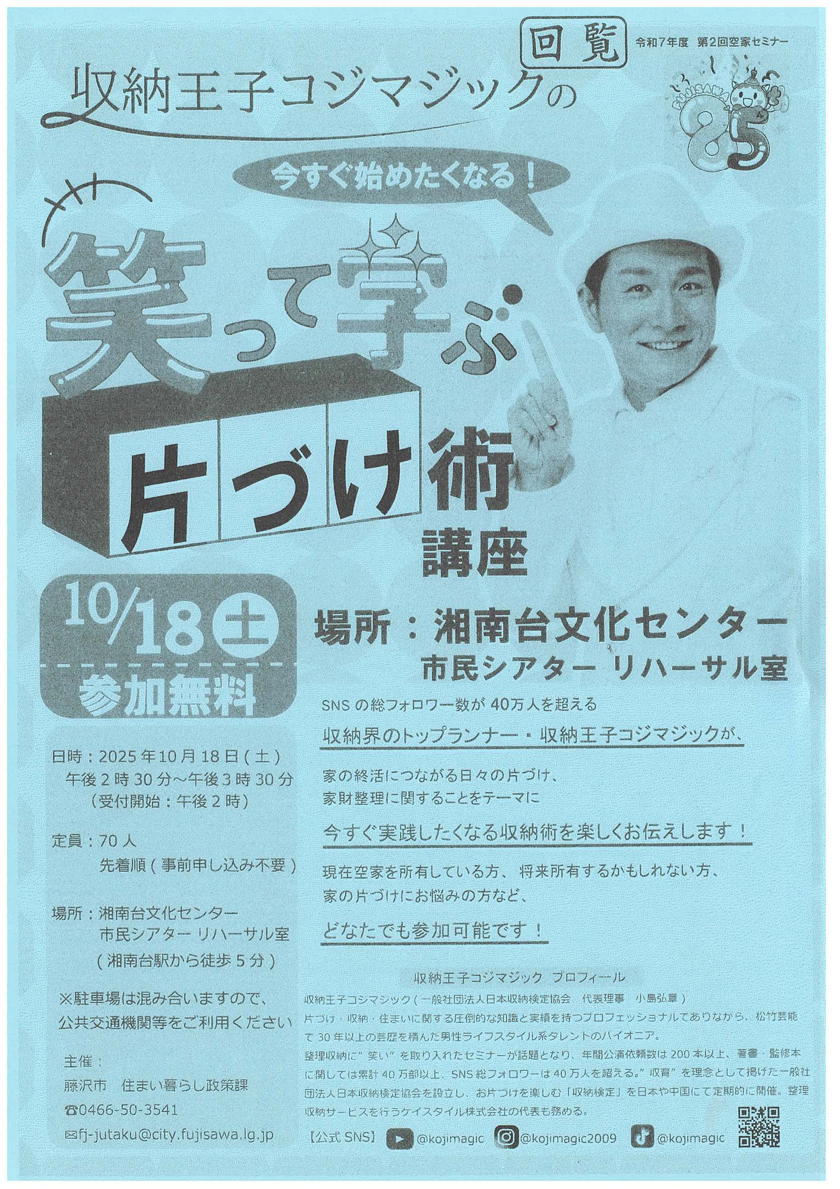 - 収納王子コジマジックの笑って学ぶ片付け術講座(JPG:470KB)【10月18日(土曜日)開催】