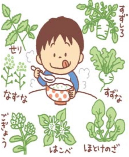 春の七草(せり、なずな、ごぎょう、はこべら、ほとけのざ、すずな、すずしろ)を入れて炊いたおかゆです。