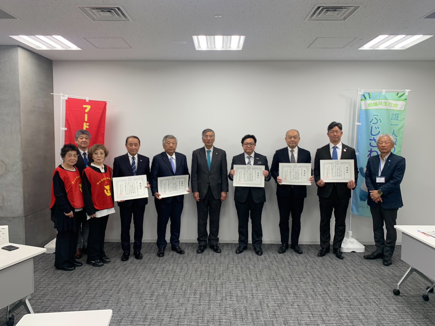 一般社団法人フードバンクふじさわの趣旨に賛同し、多額の寄附金等による支援をいただいている企業に対し、その感謝の意を表し、感謝状贈呈式を行いました。