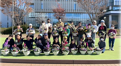 藤沢産のパンジーやビオラなどの花苗で寄せ植えを作り、管理方法も学びます。