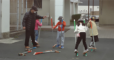 生活科の「むかしあそび」では、竹馬や缶ぽっくりなどを指導する講師を、地域の方に務めていただきました。