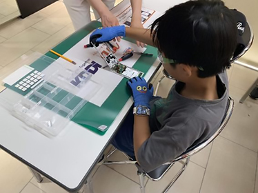 スマホを分解してリサイクルできるパーツに分ける作業、環境問題に関するクイズ。