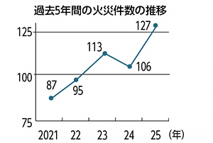 2025年中の火災件数は127件で、前年に比べて21件の増加となりました。