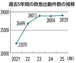2025年中の救急出動件数は2万8129件(対前年比125件増、0.4%増)、搬送人員は2万5534人(対前年比91人増、0.4%増)で救急出動件数、搬送人員ともに過去最多となりました。