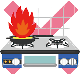 こんろ火災は調理中の不注意などにより発生する、身近で起こりやすい火災です。調理中はその場を離れない、こんろの近くに物を置かない、こんろやグリルの回りはこまめに掃除するなど、火災が発生しやすい環境を作らないよう気を付けましょう。