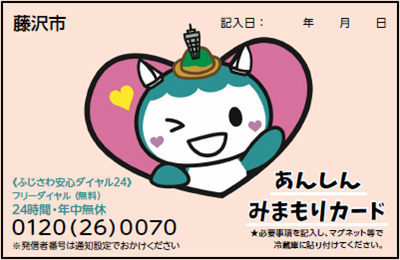 あんしんみまもりカードとは、緊急連絡先・医療情報などを記入して冷蔵庫に貼り付けておくことで、緊急時に救急隊が迅速に適切な処置を行ったり、親族へ連絡したりすることを目的としたカードです。