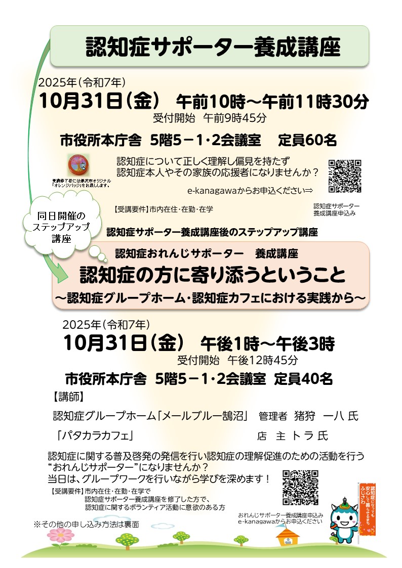 今回は、認知症サポーター養成講座を同日に開催予定です。こちらをご覧いただき、別途お申込ください。