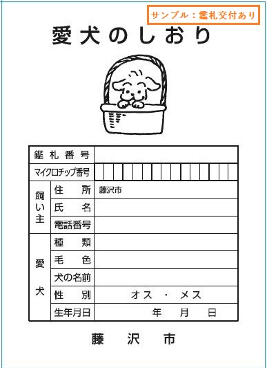 愛犬のしおり 鑑札番号・マイクロチップ番号、飼い主・飼い犬の情報、狂犬病予防注射の接種記録等を飼い主様ご自身で記入できます。 なお、このしおりをお持ちいただくことで、藤沢市に登録があることが確認できますので、動物病院の受診の際などにお持ちください。 また、紛失された場合は、藤沢市保健所(4階・生活衛生課の窓口)で、新しいものをお渡しできます(無料)。 |
