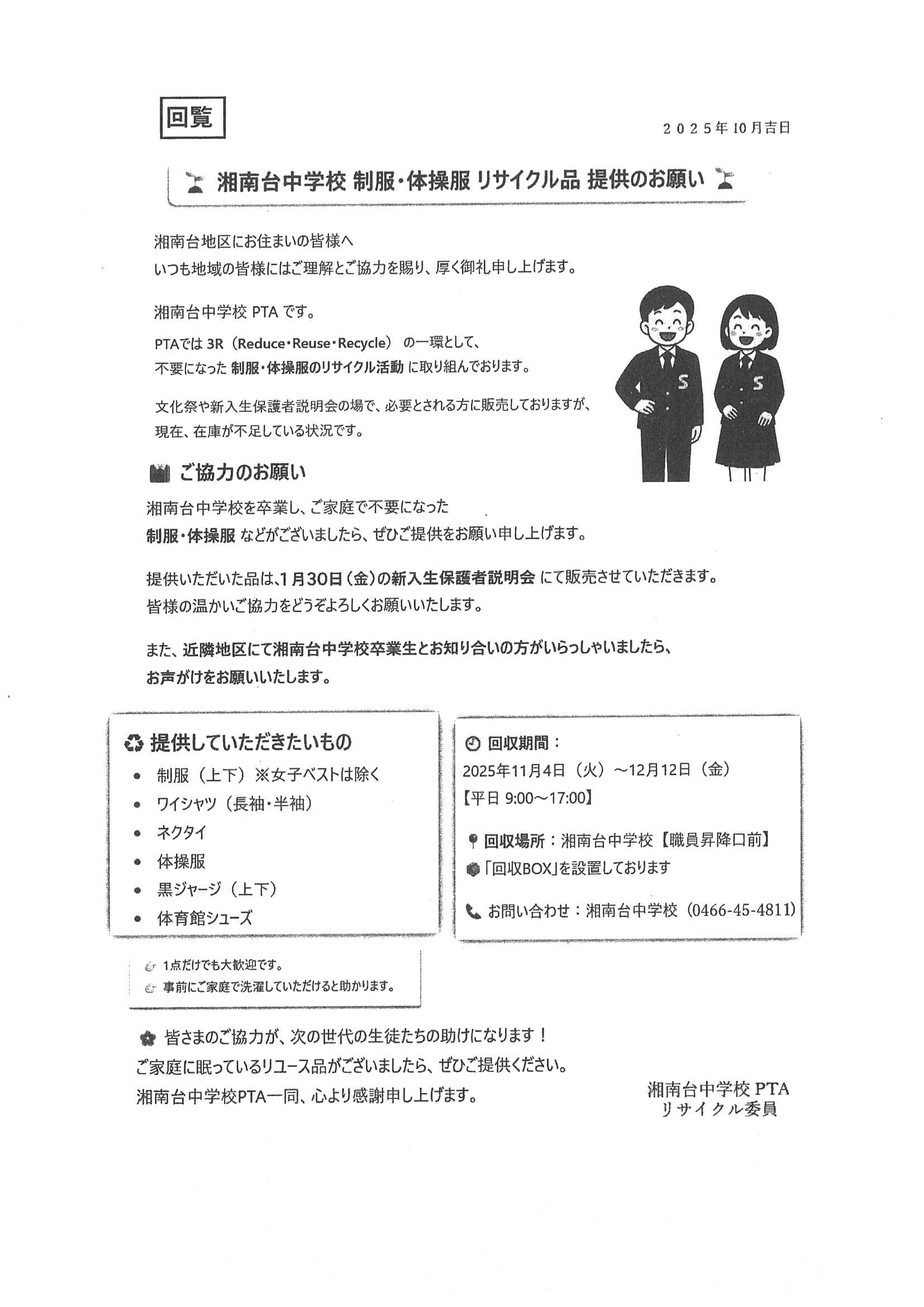 - 湘南台中学校 制服・体操服リサイクル品提供のお願い(JPG:184KB)