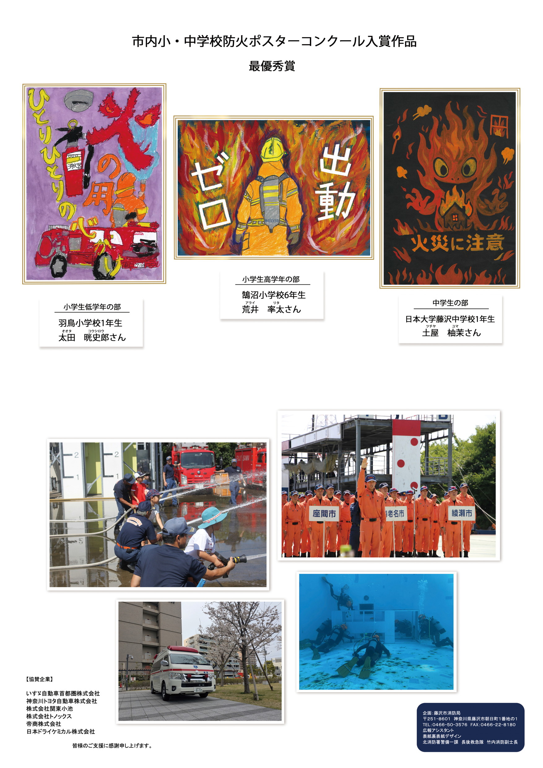 表紙のデザインは当局の職員が作成しました。各ページには藤沢市の施設を背景に消防車や救急車など掲載されています!