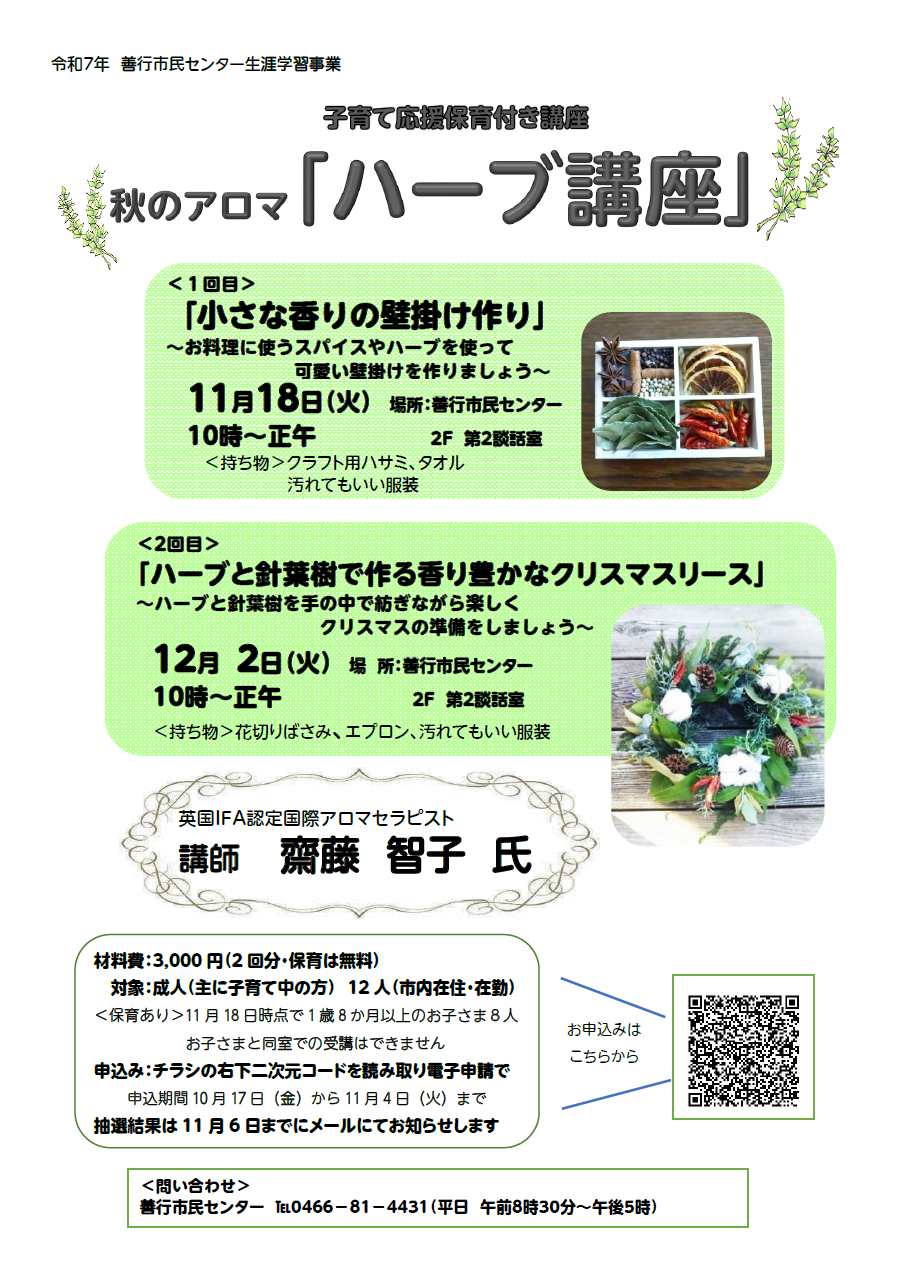 子育て応援保育付き講座 秋のアロマ「ハーブ講座」